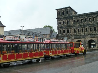 Heute mussten wir früh aufstehen, denn wir wollten eine Schiffstour unternehmen. Nach dem Frühstück machten wir uns gut gelaunt auf den Weg zur Schiffsanlegestelle. Wir kauften die Tickets und schon konnte unsere Schifffahrt auf der Mosel beginnen. Der Wettergott meinte es leider nicht besonders gut mit uns. Es regnete hin und wieder, sodass wir von der schönen Landschaft nicht so viel sehen konnten. Nach unserer Tour spazierten wir wieder in Richtung Stadt. Im Stadtpark suchten wir uns ein Plätzchen (es hatte mittlerweile aufgehört zu regnen), um uns mit dem Inhalt unserer leckeren Lunch-Pakete zu stärken. Da wir die Porta Nigra gestern nicht von innen gesehen hatten, kauften wir Eintrittskarten und erklommen die Stufen hinauf zum „schwarzen Tor“. Von oben hatten wir eine fantastische Aussicht über die Stadt. Anschließend unternahmen wir dann noch eine Fahrt mit dem sogenannten Römerexpress durch Trier.