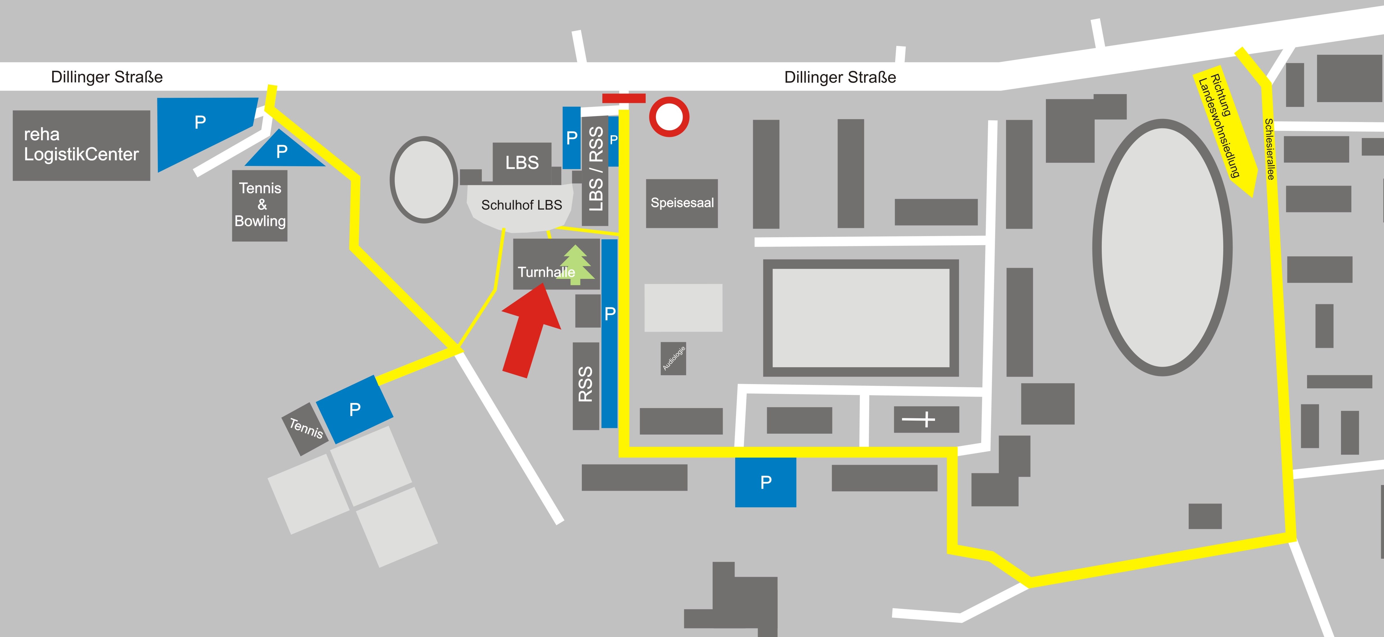 Aufgrund von Straßenarbeiten ist derzeit die Zufahrt zum Schulgelände über die Dillinger Straße nicht möglich. Zufahrt- und Parkmöglichkeiten entnehmen Sie der nachfolgenden Karte: